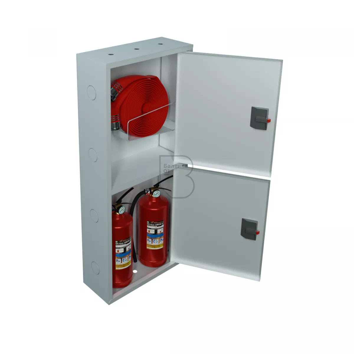 Дверцы пожарного шкафа открываются на 160 градусов. Имеют запорное устройство в виде пластиковой защелки.