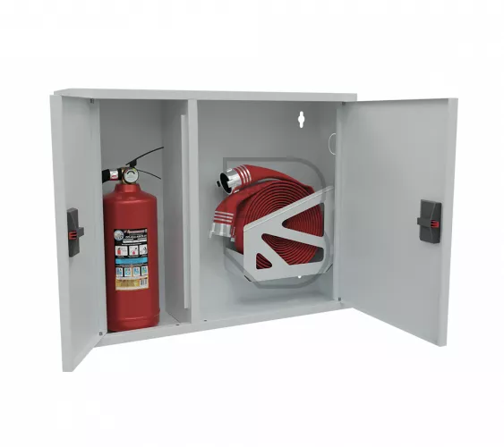 Дверца пожарного шкафа открывается на 160 градусов, открывание двери универсальное (правое и левое). Дверца имеет дополнительные загибы для усиления жесткости конструкции. На двери и корпусе шкафа предусмотрены отверстия для опломбирования шкафа. Дверь пожарного шкафа имеет запорное устройство в виде пластиковой защелки. Дверь закреплена с помощью монтажного штифта, при необходимости она может быть снята в результате простого нажатия на кнопку штифта.